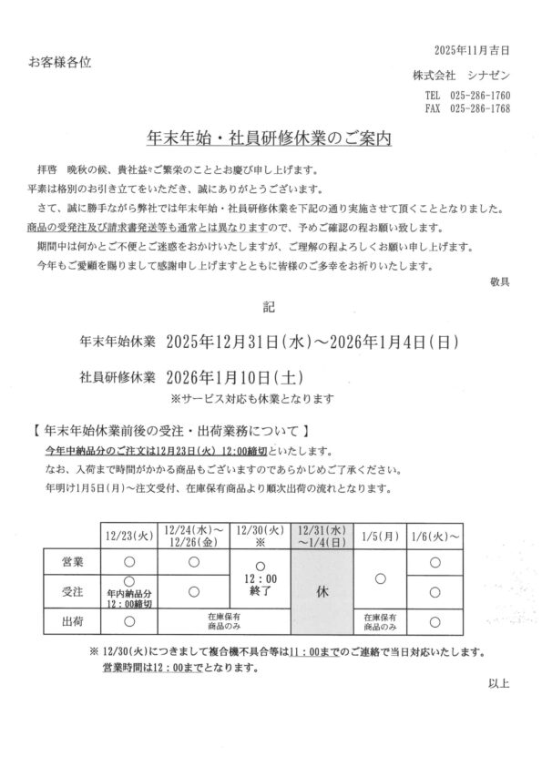 年末年始、および臨時休業のご案内(2025年12月31日~2026年1月4日、1月10日) 2025/12/08 お気軽にお問い合わせくださいご依頼及び業務内容へのご質問などお気軽にお問い合わせください 025-286-1760電話でのお問い合わせはこちら メールでのお問い合わせお気軽にお問い合わせください